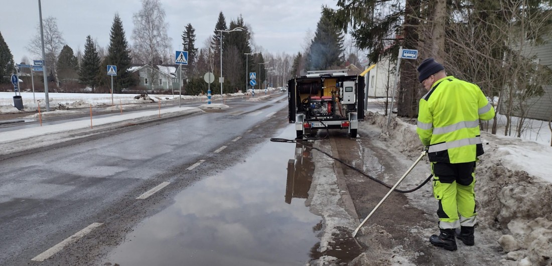 Kevät tuli tänäkin vuonna yllättäen ja etenee kovaa vauhtia. Teiden varsille ja liittymien tuntumaan ilmestyy isoja lammikoita, joita pyritään ehkäisemään kaivinkonetöillä. Sitten kun sulamisvesistä alkaa olla haittaa, eivätkä jäätyneet rummut ja kaivot vedä, otetaan käyttöön sulatuskalusto. Kunnallistekniikan liikelaitos on hankkinut tänä keväänä uuden höyrynkehittimen, jonka avulla päästään nopeasti ja kätevästi aukaisemaan reittejä tulvavesille. Sulatustöiden lisäksi höyrynkehitintä voi käyttää myös esimerkiksi rikkaruohojen torjuntaan katualueilla ja -kiveyksillä.
