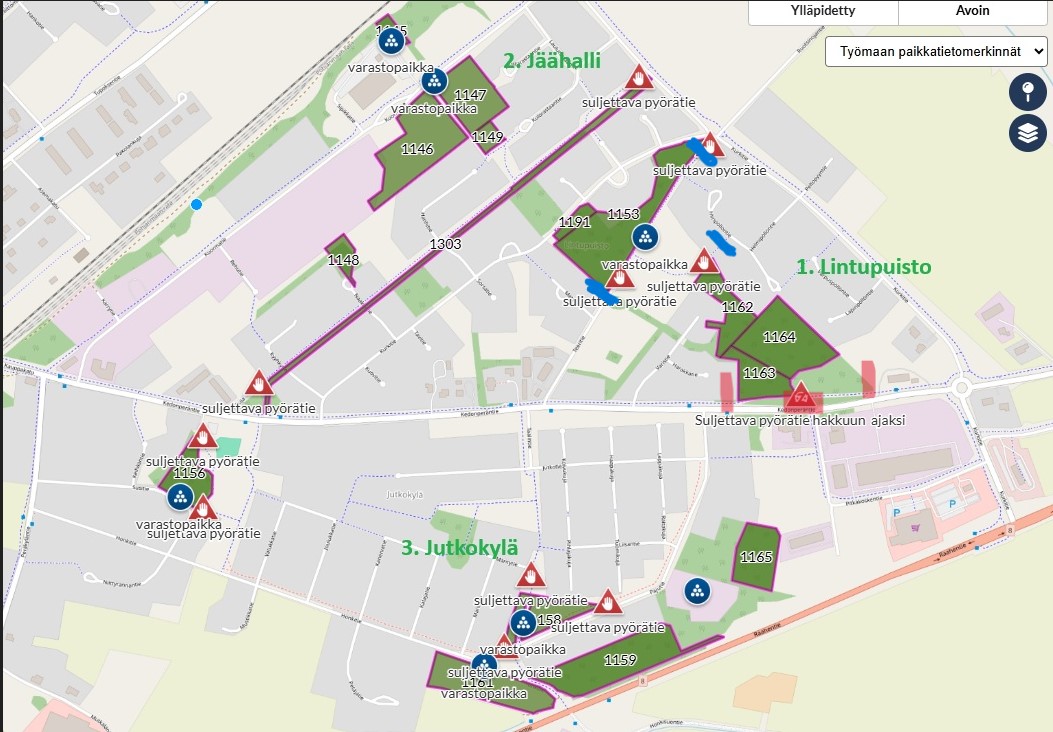 Nyt kun Lintupuiston metsänhoitotyöt on saatu tehtyä, on vuorossa Jutkokylän puistometsät. Lintupuiston Pöllönleikin alueen pyörätiet pysyvät vielä kuitenkin suljettuina, kunnes risukasat ja puut on ajettu pois. Samoin myös Susiojan varrella kulkeva Karjakujan pyörätie pysyy vielä suljettuna.