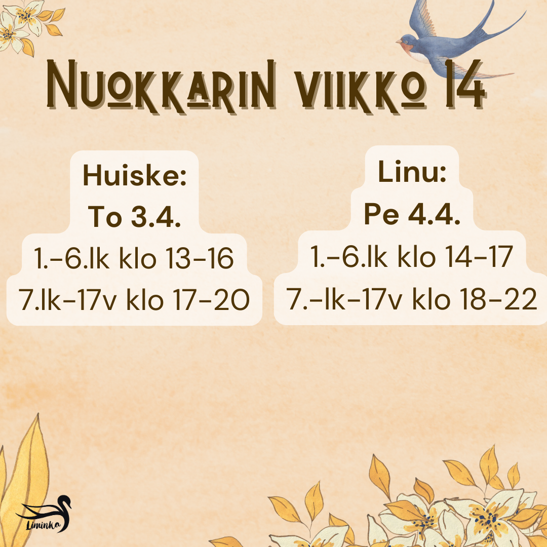 Tässä viikon 14 nuokkari aukiolot. Nuokkarille ovat tervetulleita itse kukanenkin!