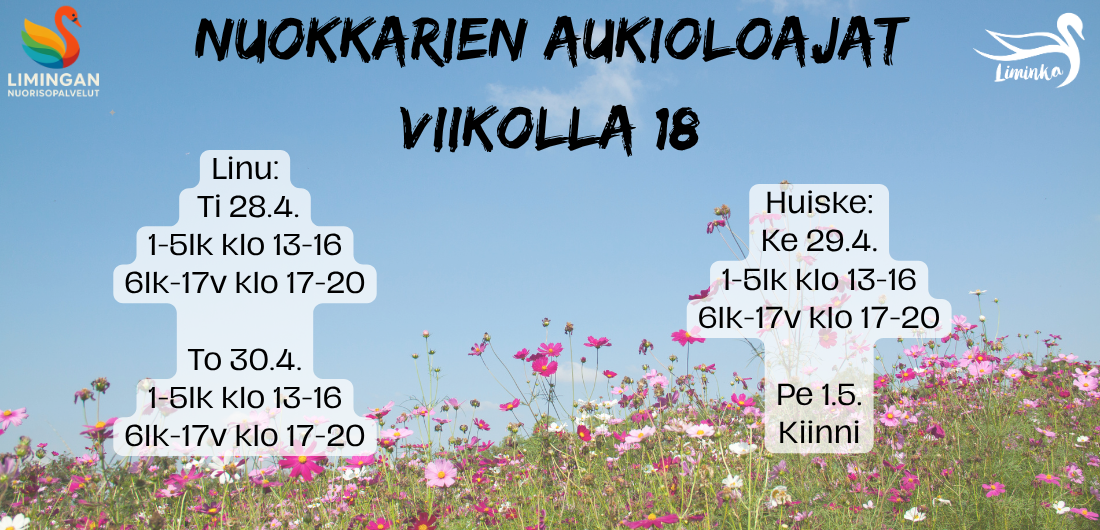 Tässä viikon 18 nuokkarin aukiolot. Nuokkarille ovat tervetulleita itse kukanenkin!