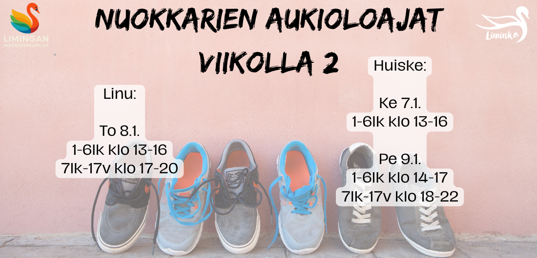 Tässä viikon 2 nuokkarin aukiolot. Nuokkarille ovat tervetulleita itse kukanenkin!