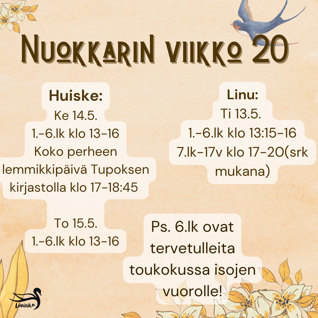 Tässä viikon 20 nuokkari aukiolot. Nuokkarille ovat tervetulleita itse kukanenkin!