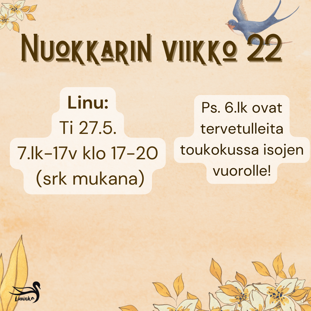Tässä viikon 22 nuokkari aukiolot. Nuokkarille ovat tervetulleita itse kukanenkin!