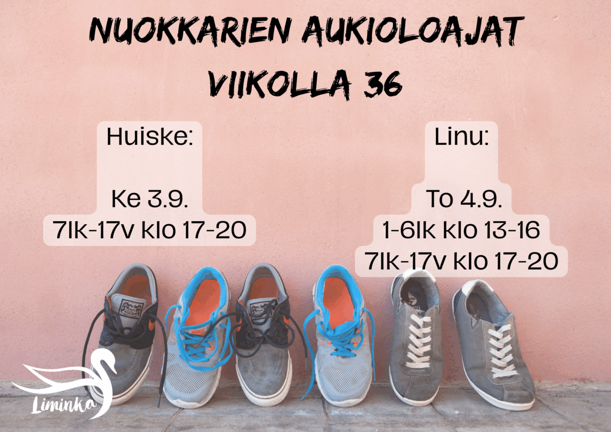 Tässä viikon 36 nuokkari aukiolot. Nuokkarille ovat tervetulleita itse kukanenkin!