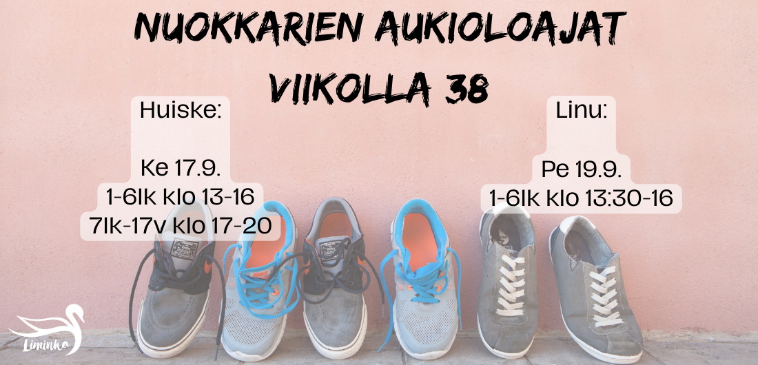 Tässä viikon 38 nuokkari aukiolot. Nuokkarille ovat tervetulleita itse kukanenkin!