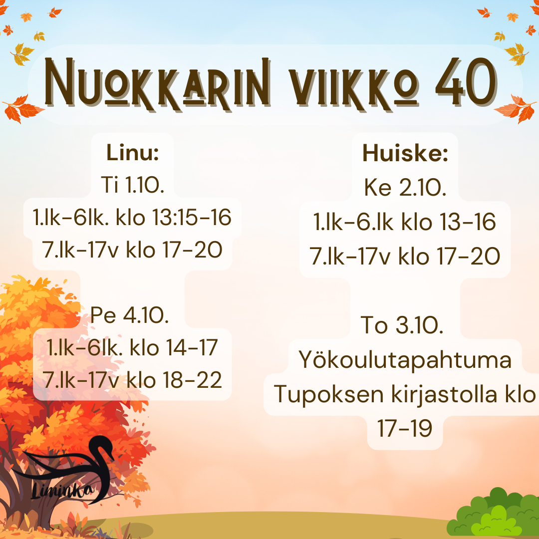Ti 1.10. 1.lk-6.lk klo 13:15-16 ja 7.lk-17v klo 17-20