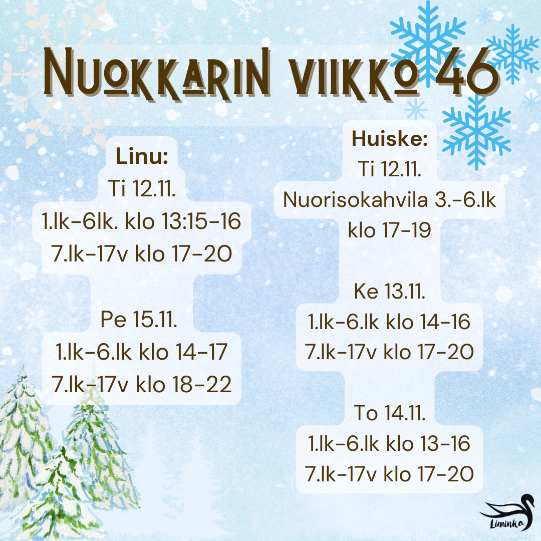 Tässä viikon 46 nuokkari aukiolot. Nuokkarille ovat tervetulleita itse kukanenkin!