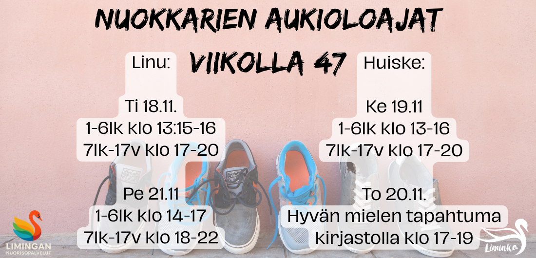 Tässä viikon 47 nuokkari aukiolot. Nuokkarille ovat tervetulleita itse kukanenkin!