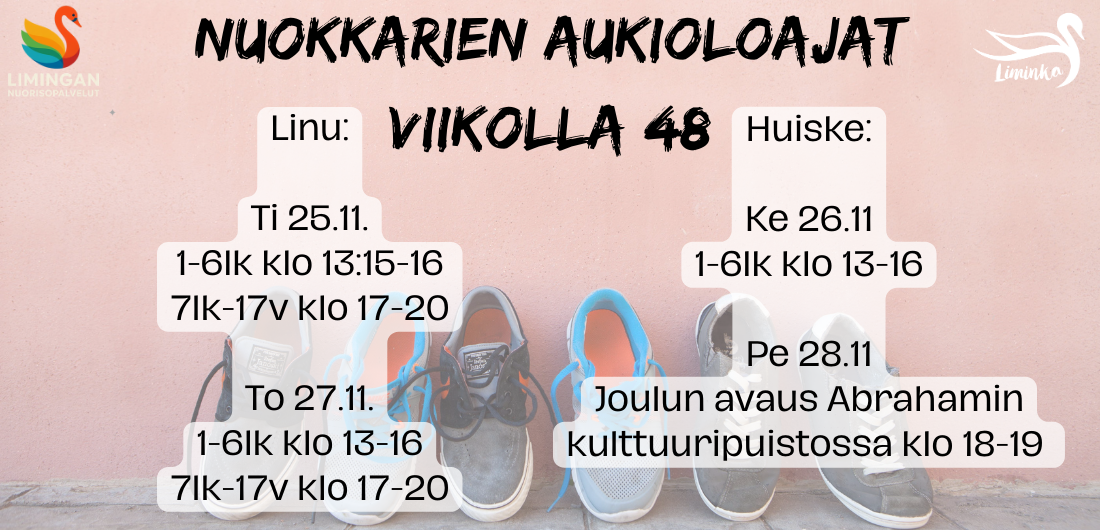 Tässä viikon 48 nuokkari aukiolot. Nuokkarille ovat tervetulleita itse kukanenkin!