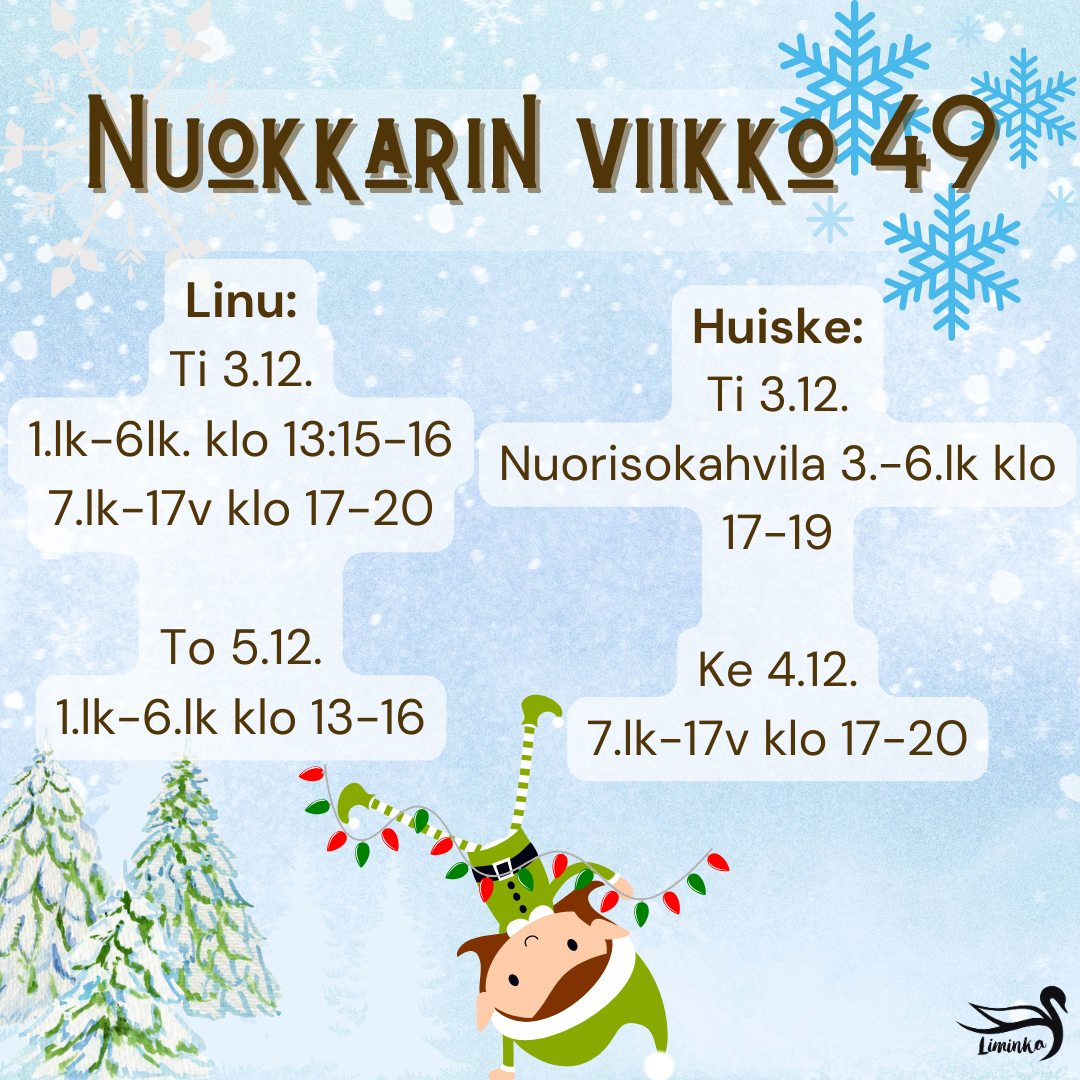 Tässä viikon 49 nuokkari aukiolot. Nuokkarille ovat tervetulleita itse kukanenkin!