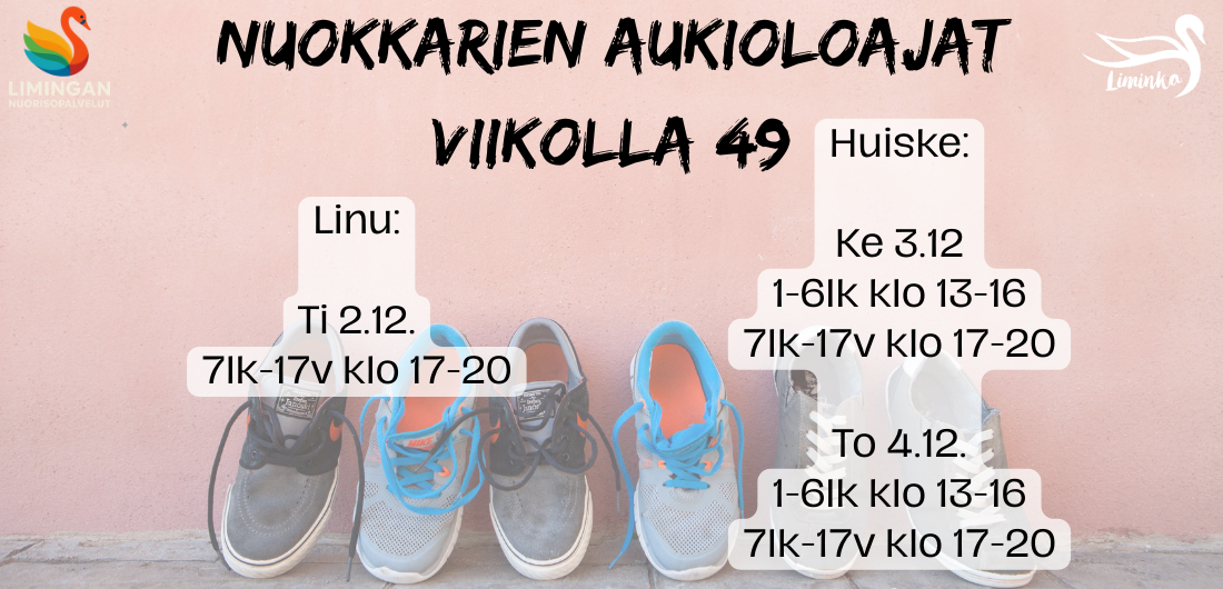Tässä viikon 50 nuokkari aukiolot. Nuokkarille ovat tervetulleita itse kukanenkin!