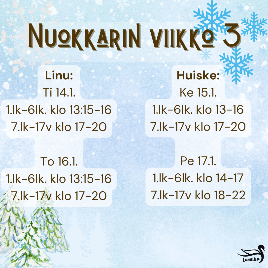 Tässä viikon 3 nuokkari aukiolot. Nuokkarille ovat tervetulleita itse kukanenkin!