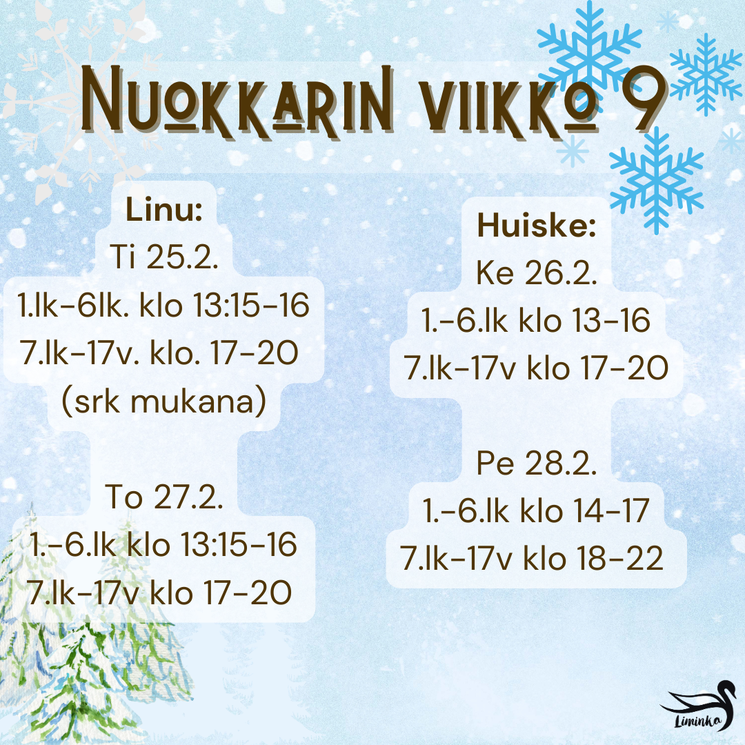 Tässä viikon 8 nuokkari aukiolot. Nuokkarille ovat tervetulleita itse kukanenkin!