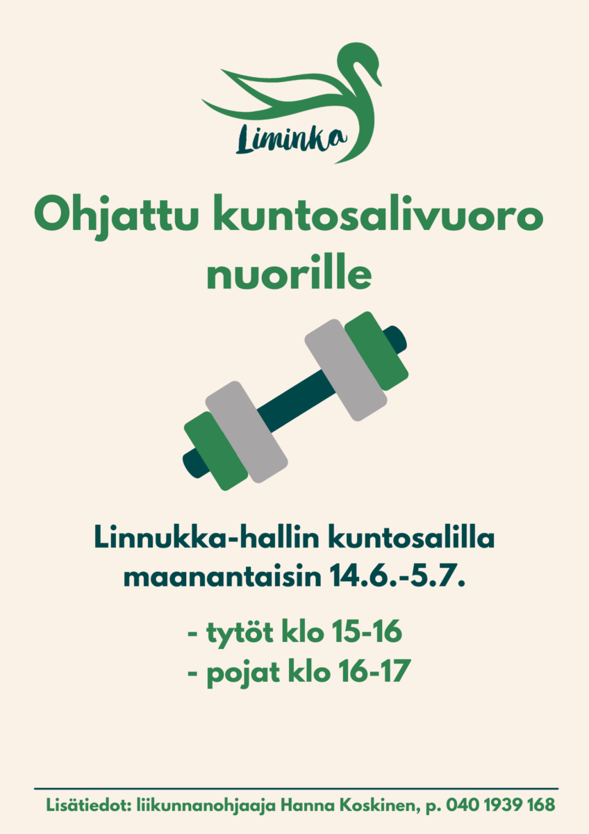 Kesäajalla nuorille ohjattu kuntosalivuoro maanantaisin 14.6.-5.7 Linnukka-hallin kuntosalilla. Lisätiedot: Liikunnanohjaaja Hanna Koskinen 040 193 9168 | hanna.koskinen@liminka.fi.