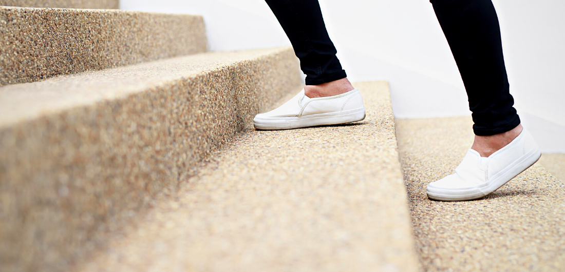 4. Myös portaiden kulkeminen alaspäin on terveydelle hyödyksi. Tämä jarruttava lihastyö vaikuttaa muun muassa jalkojen lihasvoimaan.