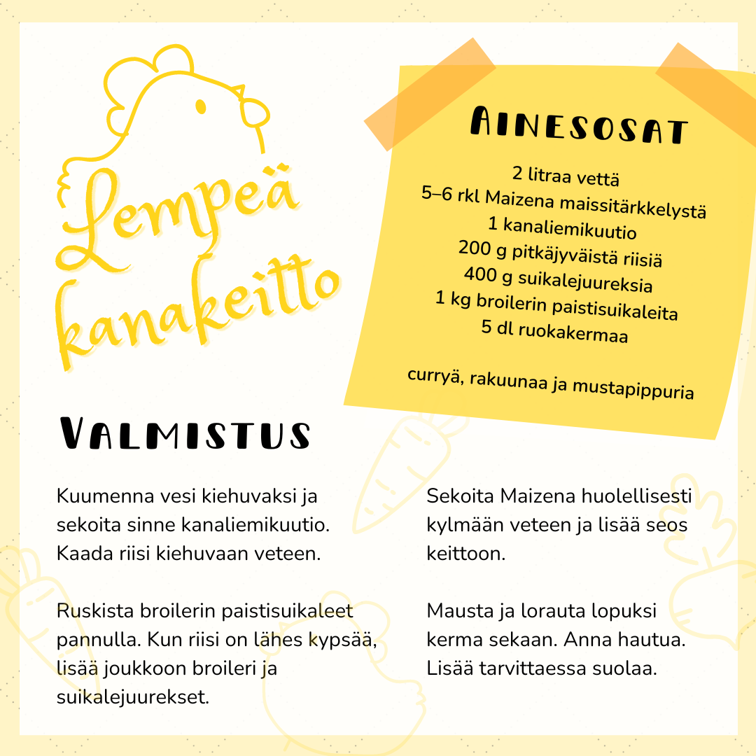 Liminganlahden keskuskeittiö tarjoaa myös syyslomalla monipuolista ja maistuvaa lounasta kunnan eri yksiköissä. Torstaina lounaslistalta löytyy yksi kestosuosikeista – lempeä kanakeitto!